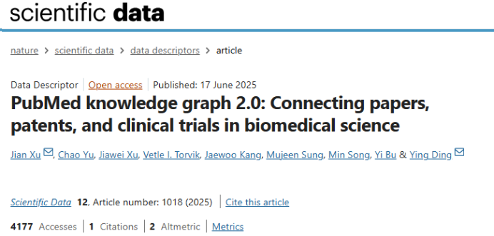 我院徐健教授课题组论文《PubMed knowledge graph 2.0: Connecting papers, patents, and clinical trials in biomedical science》发表于Nature旗下唯一数据期刊Scientific Data。PKG 2.0创新性打通论文、专利与临床试验的关联壁垒,为生物医学领域搭建起串联基础研究、临床应用与技术落地的信息桥梁,也为科学计量、人工智能领域研究者打通了跨域数据交互的关键通道,推动多学科围绕生物医学核心问题开展深度协同研究。Scientific Data作为Nature旗下聚焦数据驱动研究的核心期刊,致力于推动科学数据的共享与再利用,属于JCR一区。