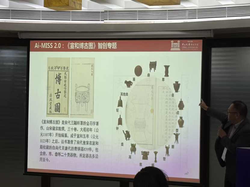 在分论坛三的主题报告中,陈涛老师以《AIGC 赋能文化遗产 “基因” 重塑 ——MISS 2.0 的实践探索》为题,系统解读了 AIGC 技术如何为文化遗产保护注入新活力。报告中,他提出了 “文化遗产基因” 概念,并将其拆解为表象、技艺、叙事、精神四大层级。以 MISS 2.0 平台为核心实践载体,依托这四层基因体系,不仅实现了多模态资源的统一组织与展示,更开发出智能问答、智能修复、文物鉴赏、文物创作等多元化功能。通过《永乐大典》知识图谱智能体构建、《宣和博古图》文物数字化鉴赏等案例,平台的实践成果直观呈现,为文化遗产的数字保护与活化传承提供了可落地的解决方案。