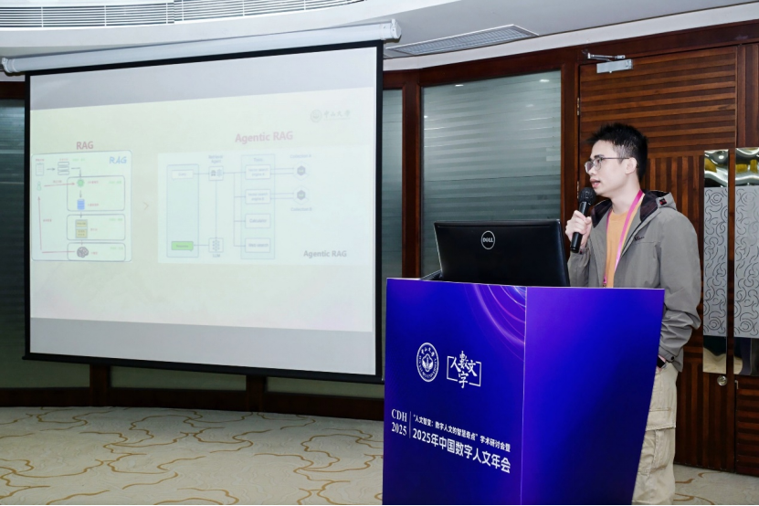 在分论坛九的论文汇报上,团队成员林志坚同学汇报了论文《基于Agentic RAG的古籍多模态知识库智能构建方法研究》,提出“感知-理解-组织-服务”四层智能处理框架:感知层实现古籍多模态解析;理解层对感知层输出的多模态数据进行深度理解和分析处理;组织层构建混合存储体系与多元化检索策略;服务层基于检索智能体(Retrieval Agent)自主规划与工具调用机制,完成多模态知识的动态检索与生成。为解决古籍多模态信息割裂问题提供了新思路。