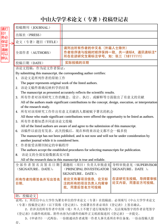 根据《中山大学预防与理学术不端行为办法》(中大研院[2019】315号)要求,2019年10月31日之后发表的论文(专著),须同步提交签名版《中山大学学术论文(专著)投稿登记表》扫描件作为佐证材料。