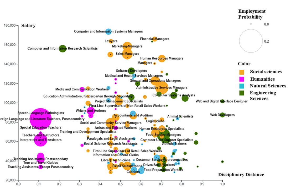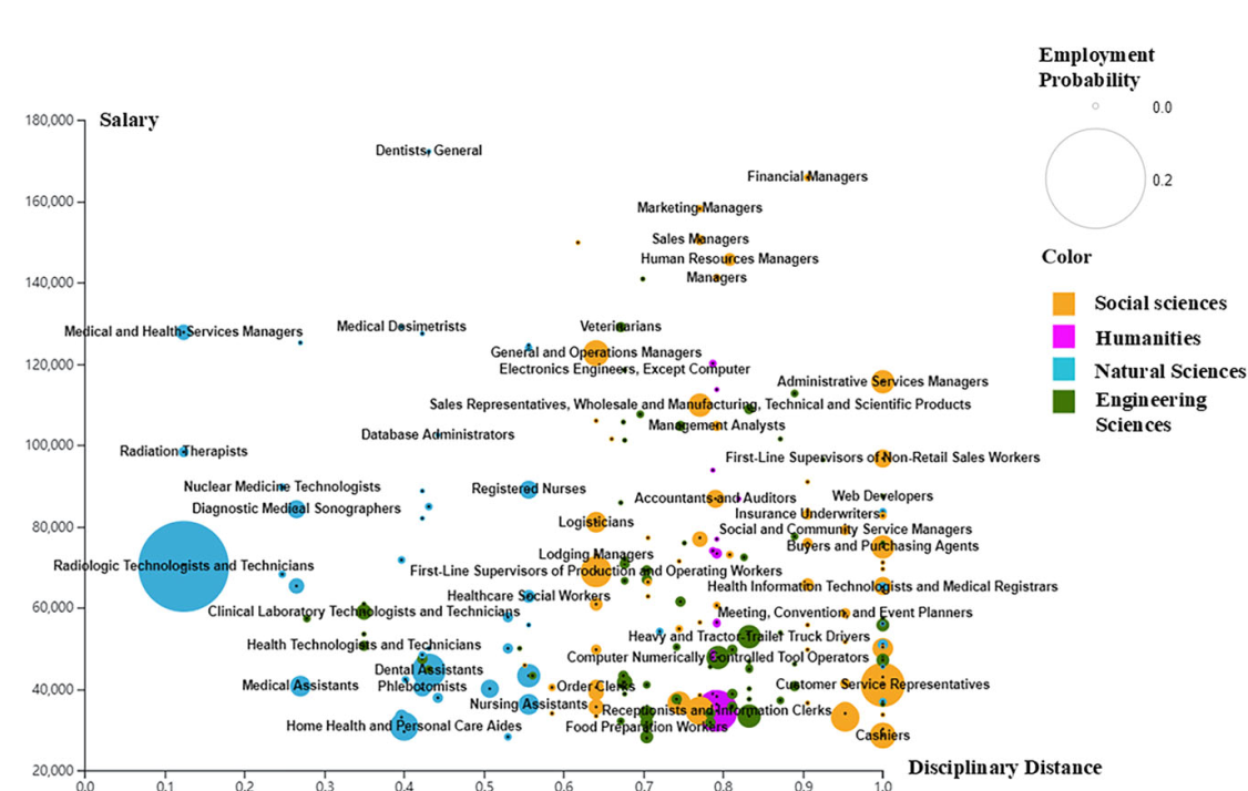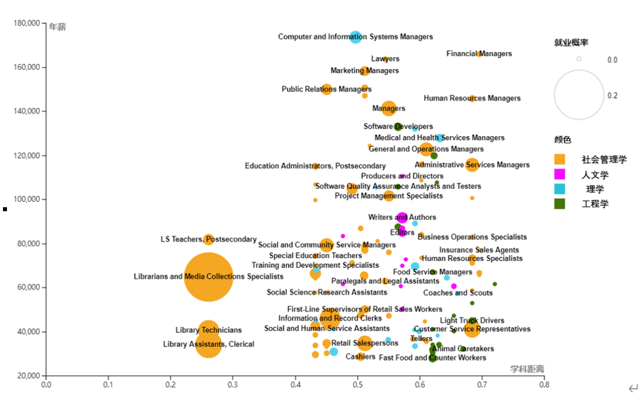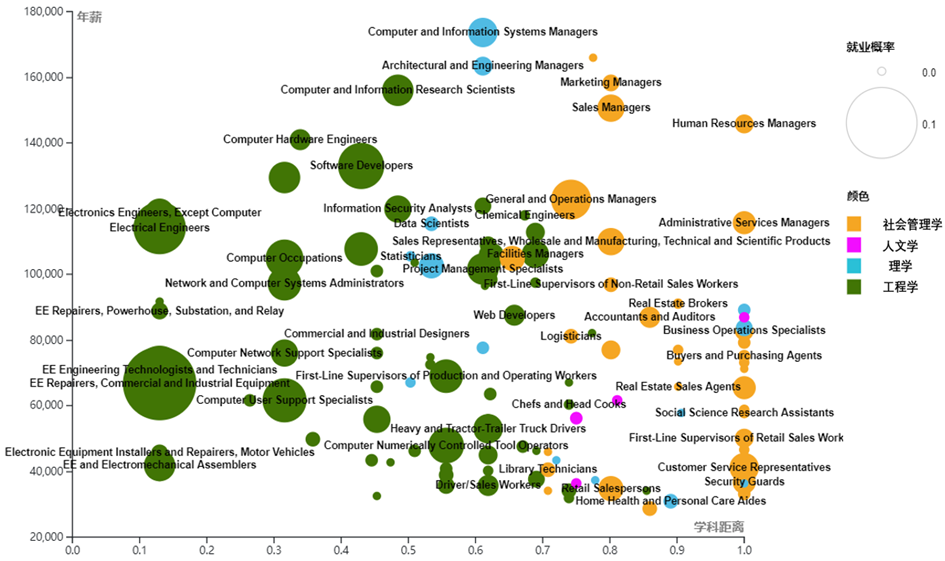 本研究综合考虑了学科距离、就业概率、薪资三要素,通过描述不同学科距离下的职业分布对跨学科就业现象做出职业层面的深入分析,如下图所示。