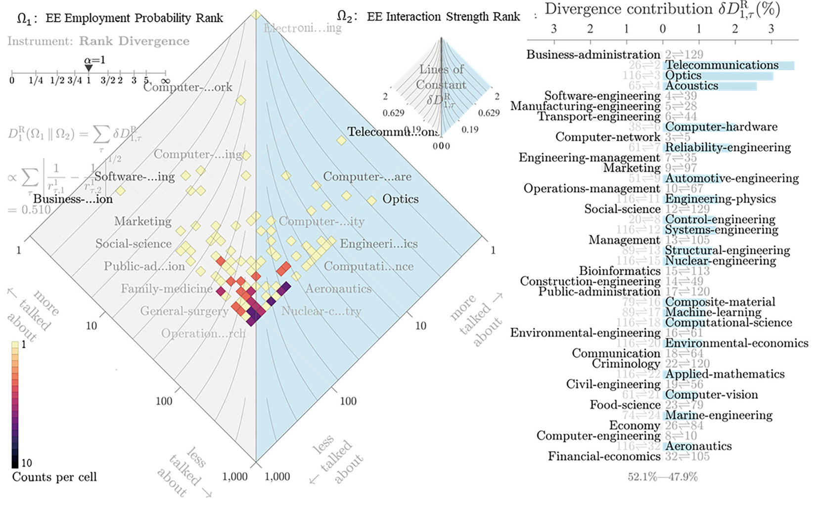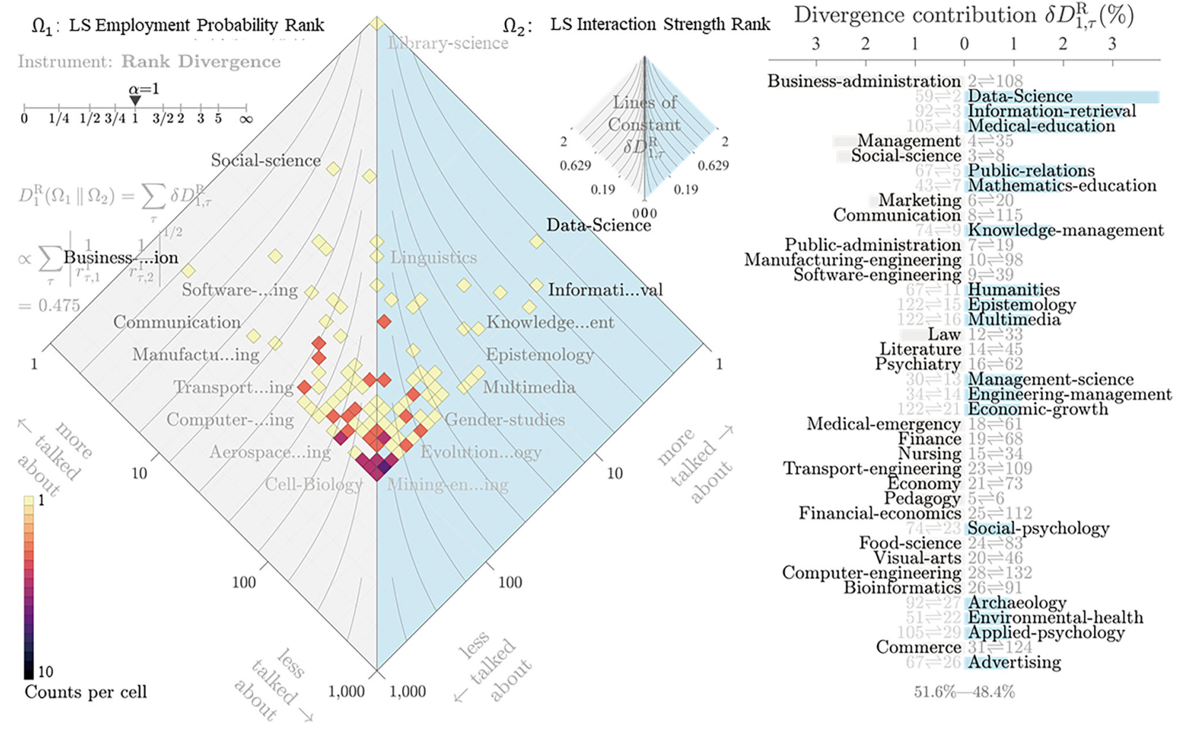 除了广泛领域的分布分析,本研究进一步对学科之间的引文交互强度与其现实就业概率的排名变动情况进行可视化对比分析,也就是分析从业者是否更趋向于跨入距离源学科更近的学科就业。以图书馆学为例,其学科排名散度图如下所示。