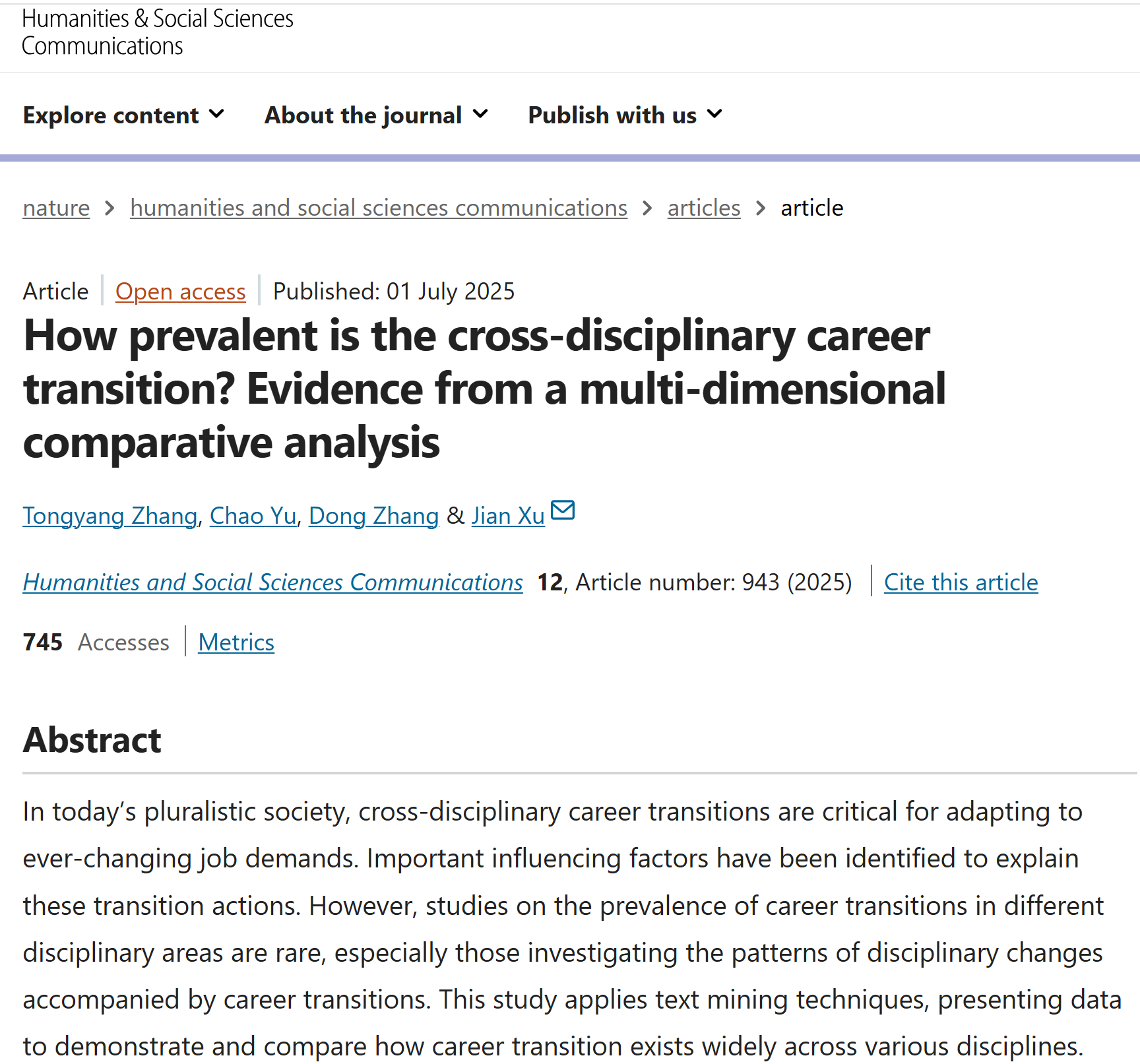 我院徐健教授、张彤阳博士、俞超博士生、张洞副教授的论文《How prevalent is the cross-disciplinary career transition? Evidence from a multi-dimensional comparative analysis》近日发表于Humanities and Social Sciences Communications。该期刊是Nature出版集团旗下人文社科领域的唯一期刊,被SSCI和AHCI收录,JCR一区和中科院一区。
